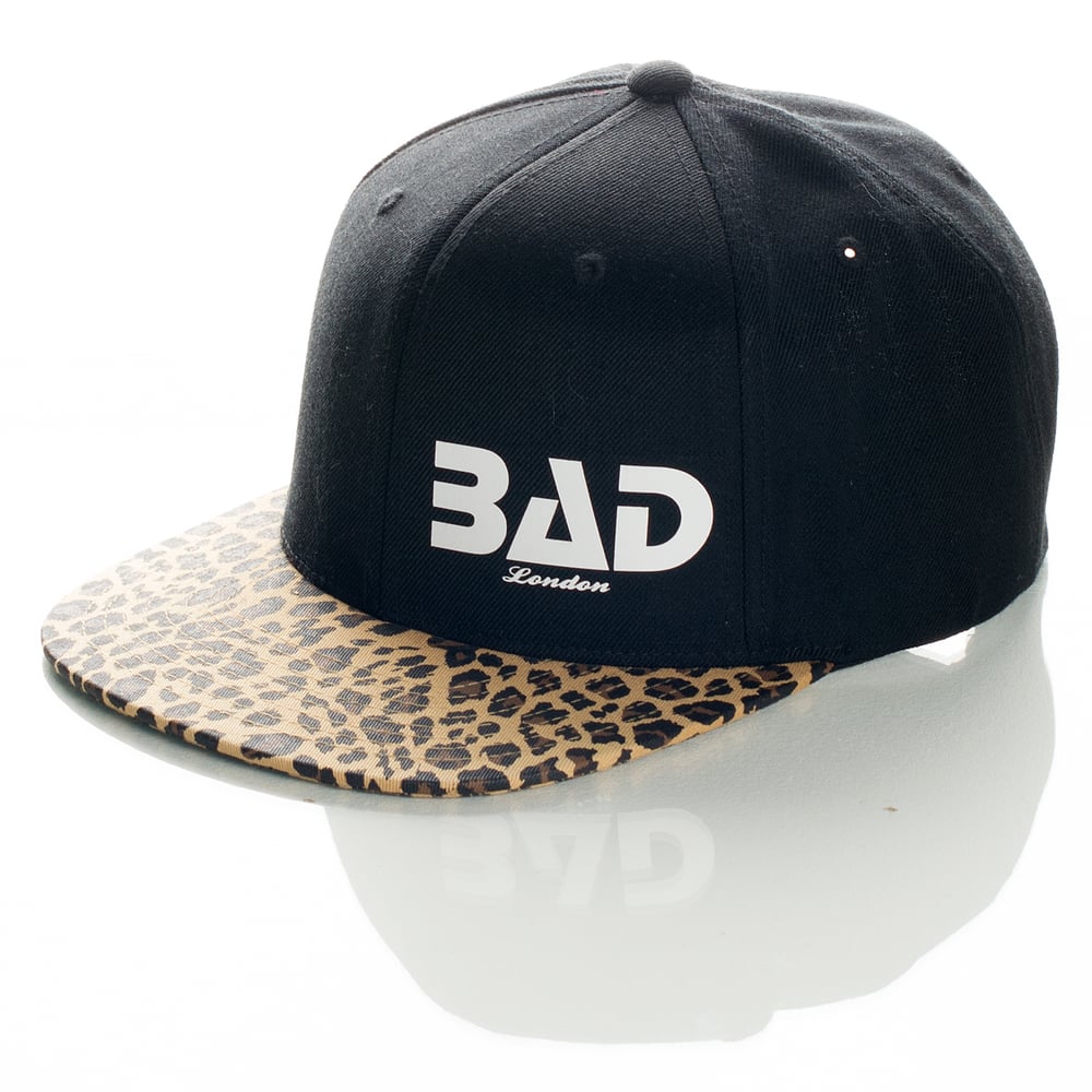BAD London Classic Shape with leopard peak snapback. Premium wood blend. Contrast plastic snap. Contrast eyelets and button. Hard buckram. Flat visor cap. Matching pattern on undervisor.